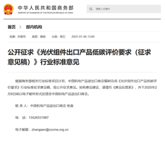 1月6日,商務部外貿司公開征求《光伏組件出口產品低碳評價要求(征求意見稿)》行業標準意見,提出415kgCO2e/kWp限值。