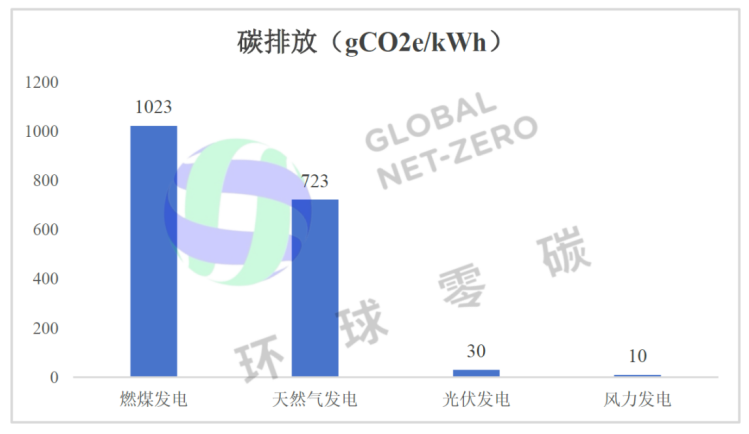 根據世界核能協會的報告,在一座電站的全生命周期內,煤電排放最大,褐煤燃燒發電可達1054 tCO2e/GW;然后是燃油發電733 tCO2e/GW、燃氣發電499 tCO2e/GW。可再生能源發電排放強度普遍較低,光伏發電、生物質、水電、風電依次為85tCO2e/GW、45 tCO2e/GW,26 tCO2e/GW、26tCO2e/GW。聯合國歐洲經濟委員會《全生命周期發電選擇》也指出,在一座電站的全生命周期內,沒有碳捕獲措施的燃煤發電,碳排放為1023 gCO2e/kWh,30%燃燒效率的天然氣發電723 gCO2e/kWh,而光伏發電、風電僅為30gCO2e/kWh、10gCO2e/kWh。